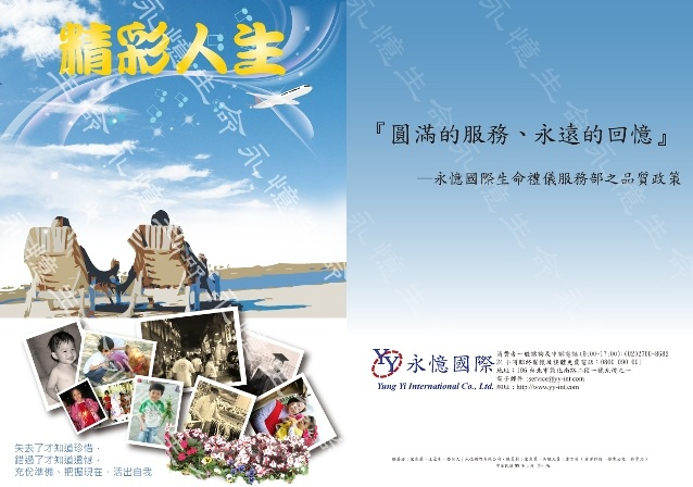 手冊中同時包括對肉體人生最後一階段(告別式及遺體處理等)規劃的想法,還有當往生後遺族家人們所需面對的一些相關現實問題及注意事項的列表,例如-遺產、須向政府辦理事項及各種保險所提供各項親族死亡的補助等。最後提及永憶國際生命禮儀服務部的服務流程簡介,並附上永憶部分殯葬服務項目及價格的參考資料,讓您藉由此手冊,對永憶的專業服務能有所了解。